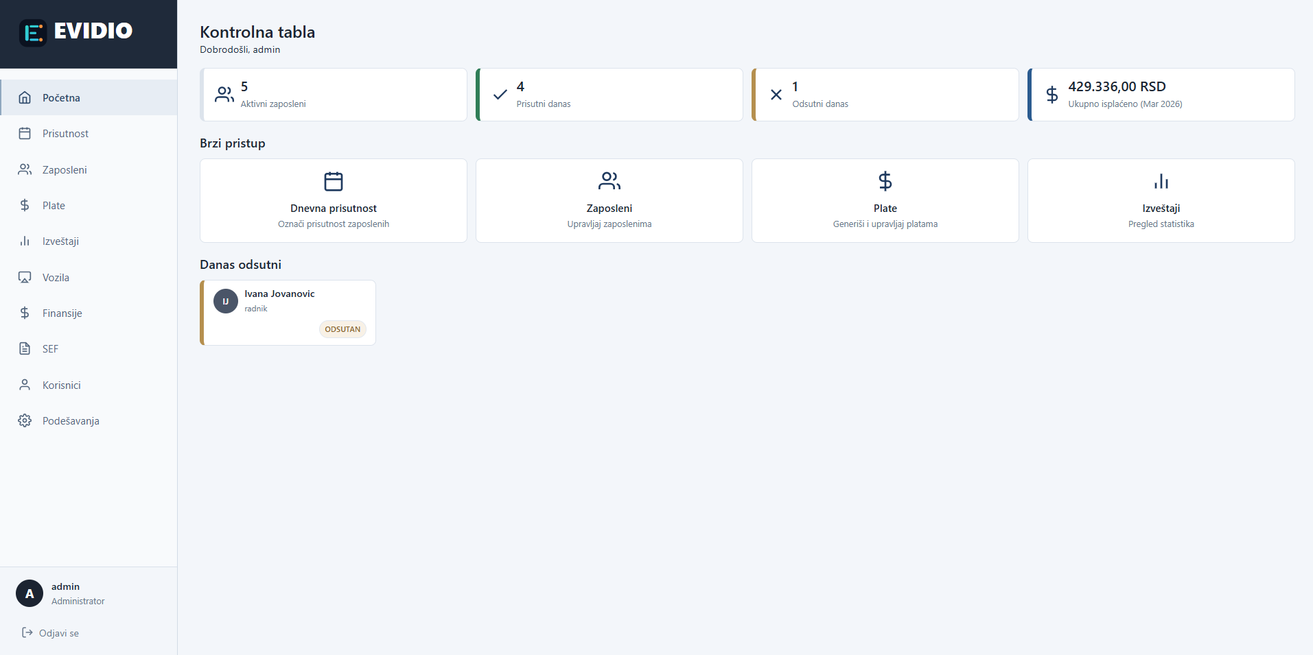 EVIDIO system: attendance tracking, payroll, expenses, and fleet in one platform